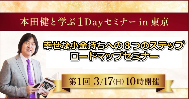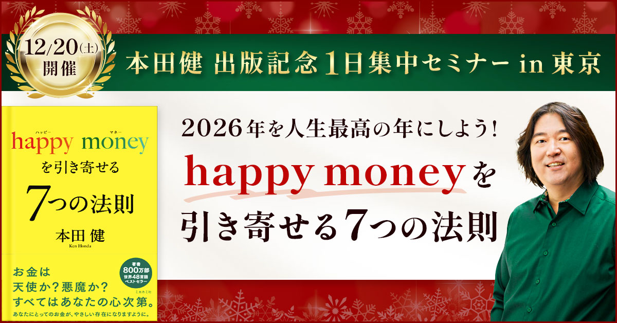 本田健が、2024年以降に東京で開催したお金に関する1日集中セミナー3回分を学べる特別セットを、期間限定でお申込みいただけるように致しました。このセットは3つのセミナーのアーカイブを、2026年12月末まで、何度でもご覧いただけるようになっています。